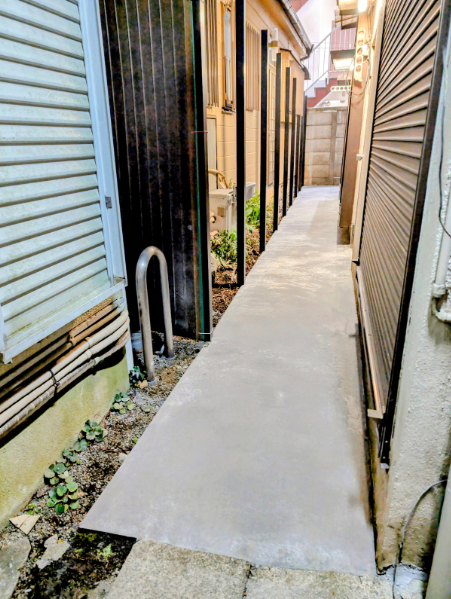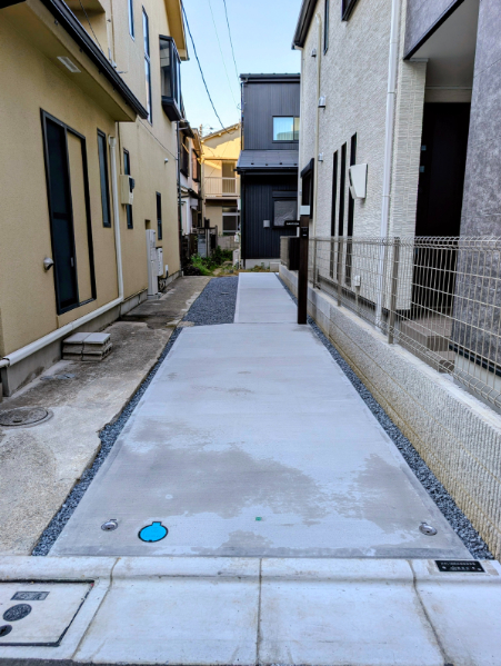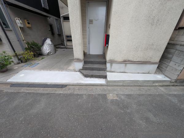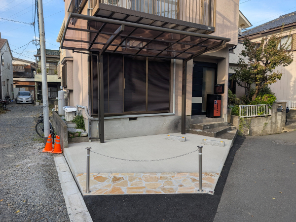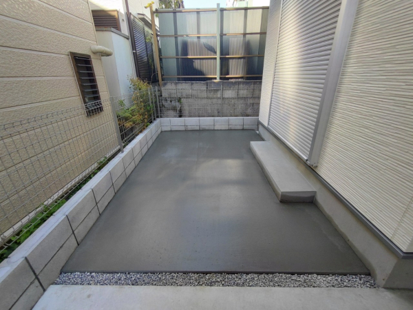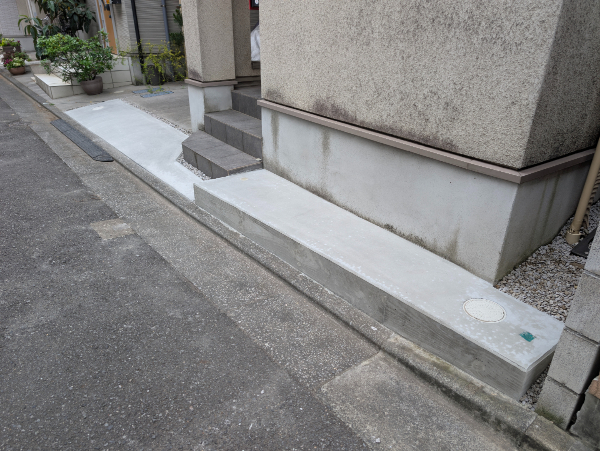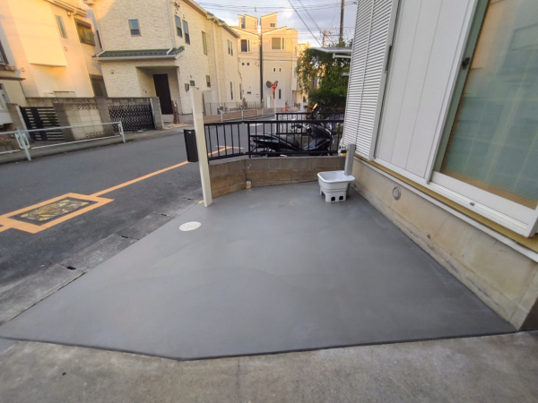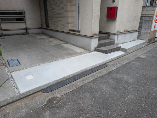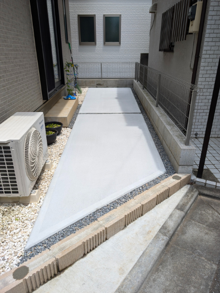 A. はい、お任せください!コンクリートを打つ前に、水がスムーズに道路や側溝へ流れるように、プロの計算で適切な「水勾配(傾斜)」をしっかりと確保して美しく仕上げます。